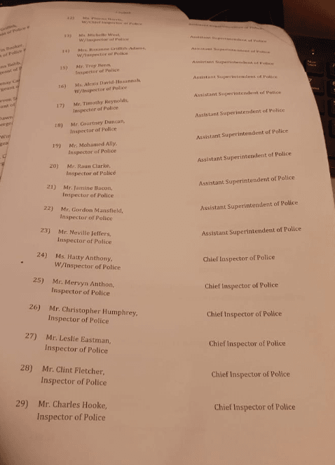 In the list which was seen by BIG Smith News Watch and which we have been able to confirm is the list of persons to be promoted, two Superintendents of Police were promoted to the rank of Senior Superintendents, they are Deputy Head of Special Branch Mahendra Siwnarine and Julius Wright who is stationed at the Police Force Criminal Investigation Department.