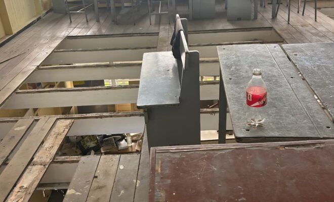 Photos provided to this publication paint a troubling picture: multiple floorboards missing and leaving large, hazardous gaps; scaffolding erected in the middle of classrooms; and furniture stacked haphazardly in corners, creating what parents describe as a chaotic and unsafe learning environment.