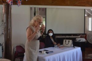 UK High Commissioner Jane Miller makes a point as Minister Vindiya Persaud looks on.