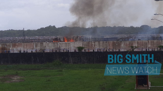 The work of the firefighters was aided by spells of showers which came shortly after the fire started even as smoke from the burning structures inside the prison compound towered over the concrete fence and could be seen from several villages away including Victoria to the East and Lodge to the West of Lusignan.