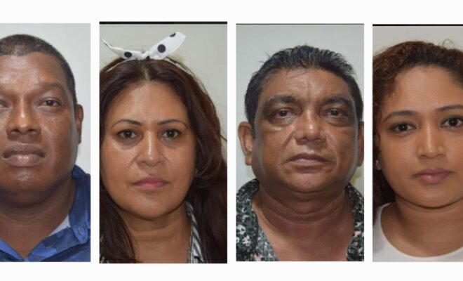 Saffee Ahmad, also known as ‘Chillo,’ 58, Shameena Ahmad, 52, Ashiana Salamalay, 33, all of 38 Roraima Scheme, Versailles, West Bank Demerara, and Ian Jacobis, 44, of 749 Plantation Best, West Coast Demerara, were separately charged with money laundering.