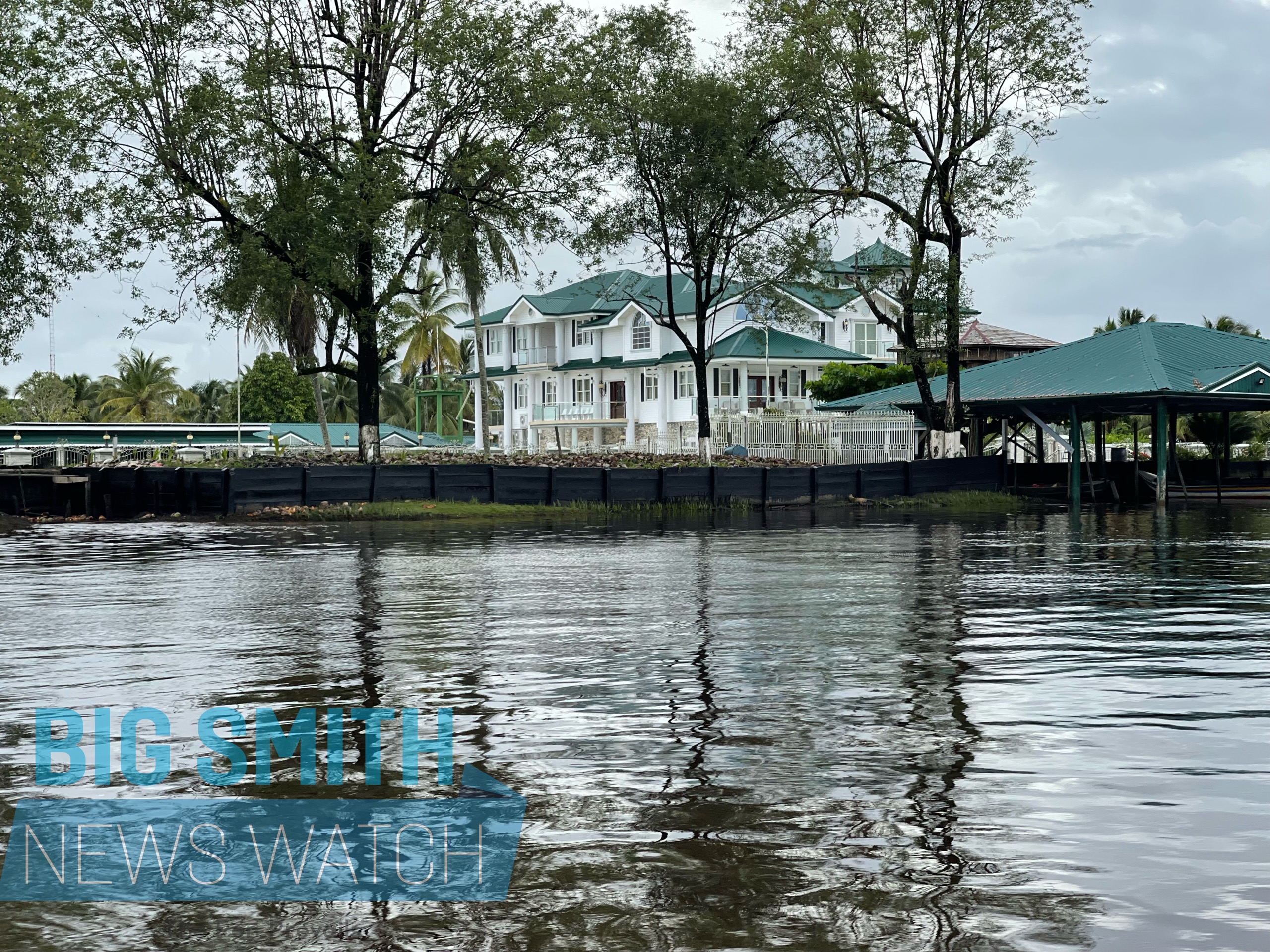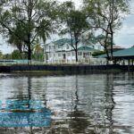 A woman rows her boat past Adel’s Tourists Resort as she makes her way further up a tributary creek of the Pomeroon River
