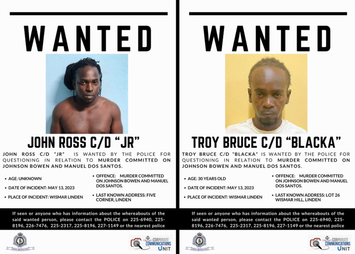 Wanted are John Ross, called ‘JR’, whose last known address was given as Five Corner, Linden, and Troy Bruce, 30, called ‘Blacka’. Police gave his last known address as Lot 26 Wismar Hill, Linden.