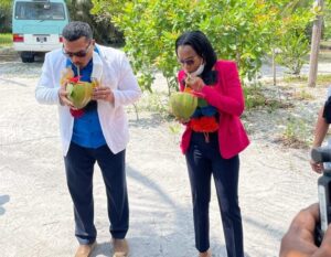 MP Lennox Shuman and Minister Walrond take a sip of coconut water